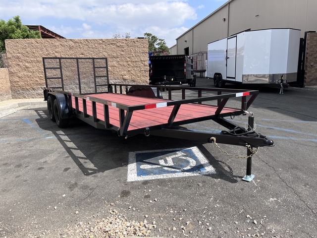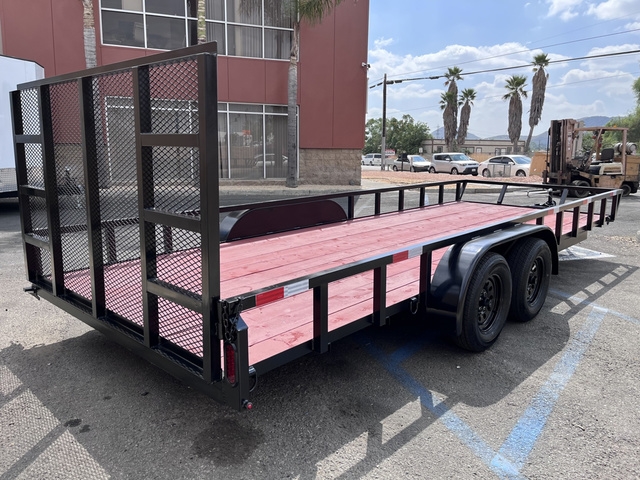 BRAND NEW FACTORY DIRECT 2026 "SXS" UTILITY TRAILER 20' 8.5 X 20 X 1 DUAL 3.5K AXLES (REAR BRAKES) SQUARE TUBE RAIL SXS ANGLED FRONT END FOR EXTRA DECK LENGTH + 7" 4' HD REINFORCED REAR RAMP GATE WITH METAL MESH HD SAFTEY CHAIN WITH HOLDERS RADIAL TIRES STANDARD RECESSED (LED) TAILLIGHTS 2X6 TREATED WOOD PLANKS OPTIONAL SPARE TIRE AND MOUNT 2 YEAR LIMITED FACTORY WARRANTY INCLUDED AT NO EXTRA COST FINANCING IS AVAILABLE. PLEASE CALL WITH ANY QUESTIONS WE ARE HAPPY TO HELP! LOCATED AT 2751 S LILAC AVE BLOOMINGTON CA
