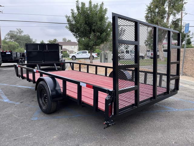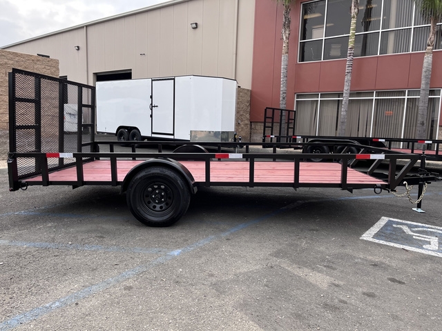 BRAND NEW FACTORY DIRECT 2026 "SXS" UTILITY TRAILER 16' 8.5 X 14 X 1 SINGLE 3.5K AXLE SQUARE TUBE RAIL SXS ANGLED FRONT END FOR EXTRA DECK LENGTH + 7" 4' HD REINFORCED REAR RAMP GATE WITH METAL MESH HD SAFTEY CHAIN WITH HOLDERS RADIAL TIRES STANDARD RECESSED (LED) TAILLIGHTS 2X6 TREATED WOOD PLANKS OPTIONAL SPARE TIRE AND MOUNT 2 YEAR LIMITED FACTORY WARRANTY INCLUDED AT NO EXTRA COST FINANCING IS AVAILABLE. PLEASE CALL WITH ANY QUESTIONS WE ARE HAPPY TO HELP! LOCATED AT 2751 S LILAC AVE BLOOMINGTON CA